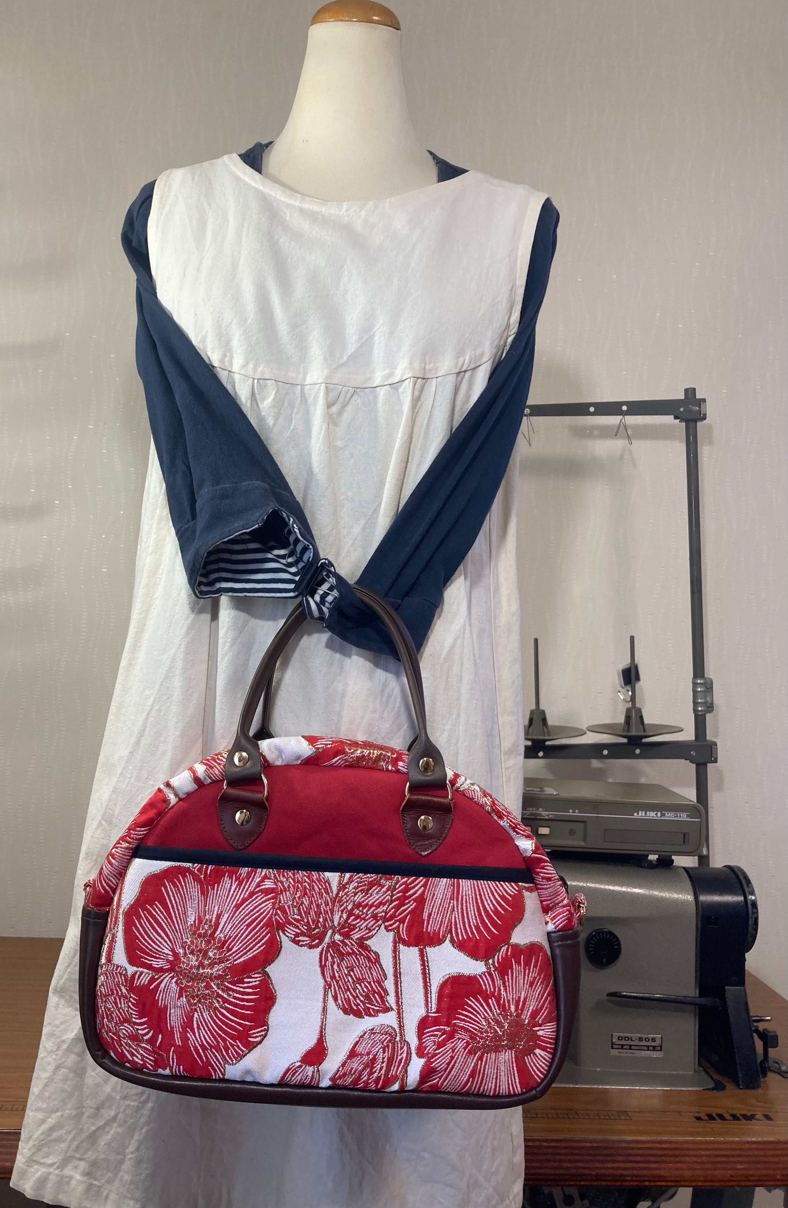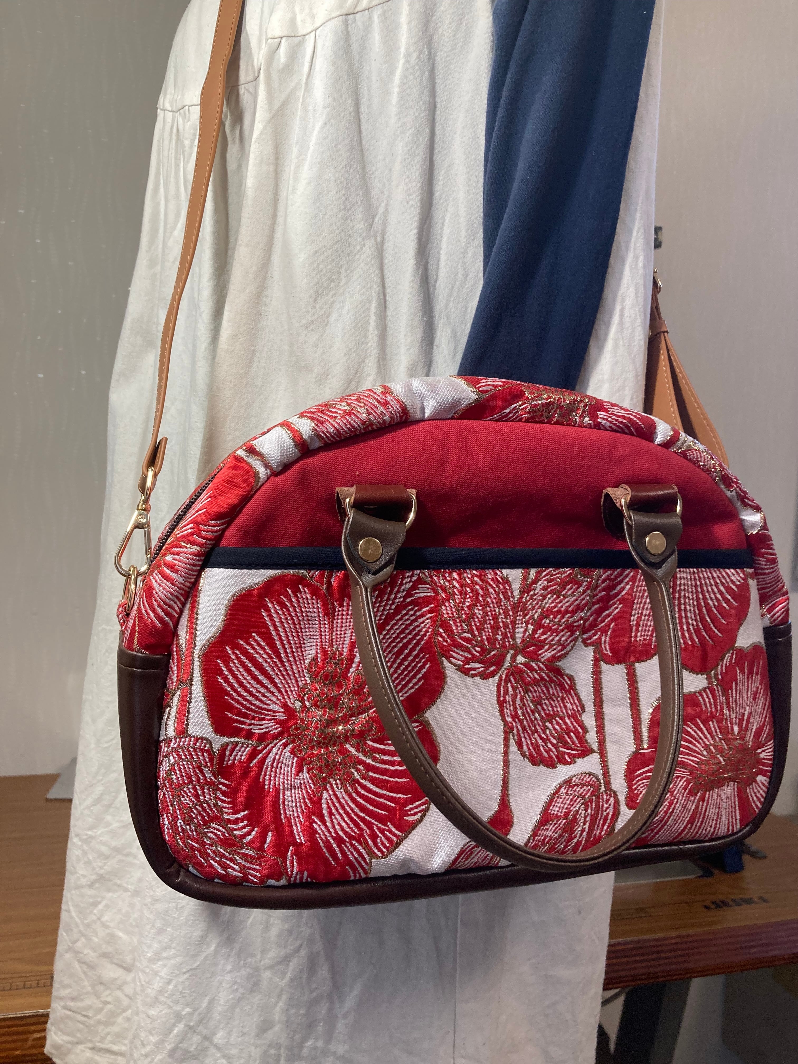鮮やかな赤い花柄が特徴のボストンバッグです。この魅力的なデザインは、和モダンの風情を醸し出し、どんなコーディネートにも合わせやすいのがポイントです。持つだけで一気に華やかさを加え、お出かけが楽しみになること間違いなしです。