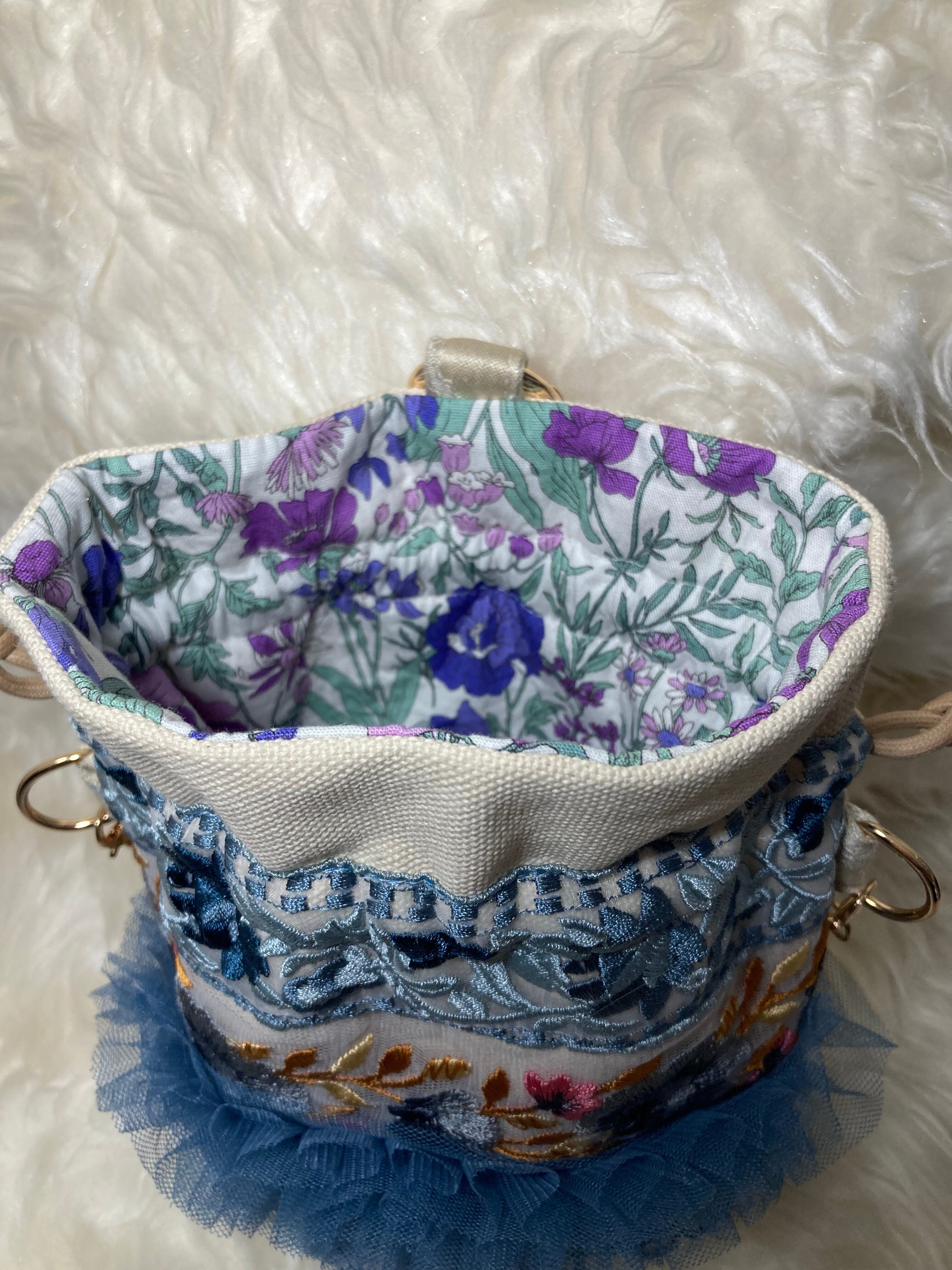 帆布8号とインド刺繍リボンを使用した、多機能のミニ巾着バッグです。独自のフリルリボンがアクセントになり、シンプルながらも存在感のあるスタイルを演出します。軽量で持ち運びやすく、日常使いにも特別なシーンにも適しています。