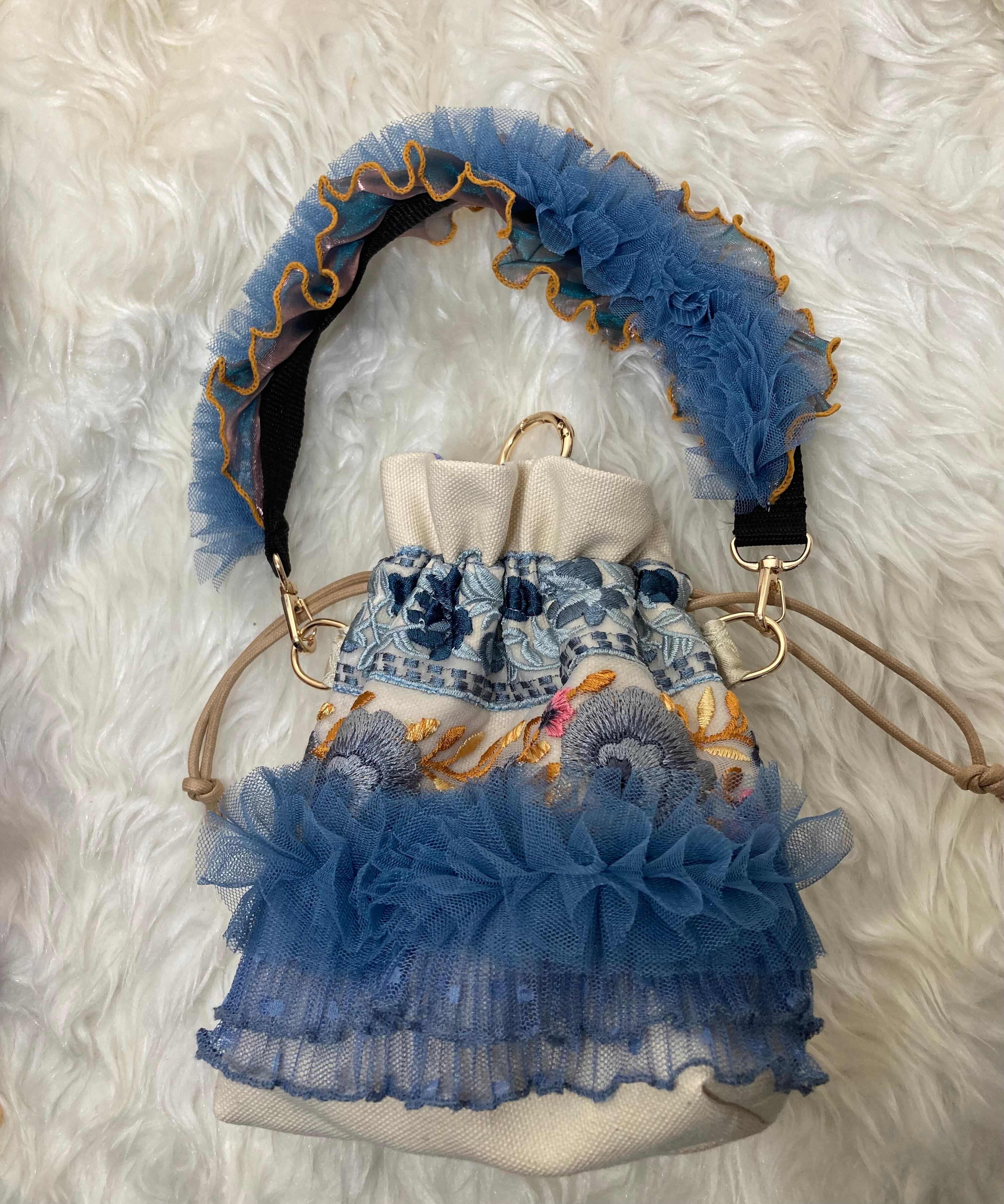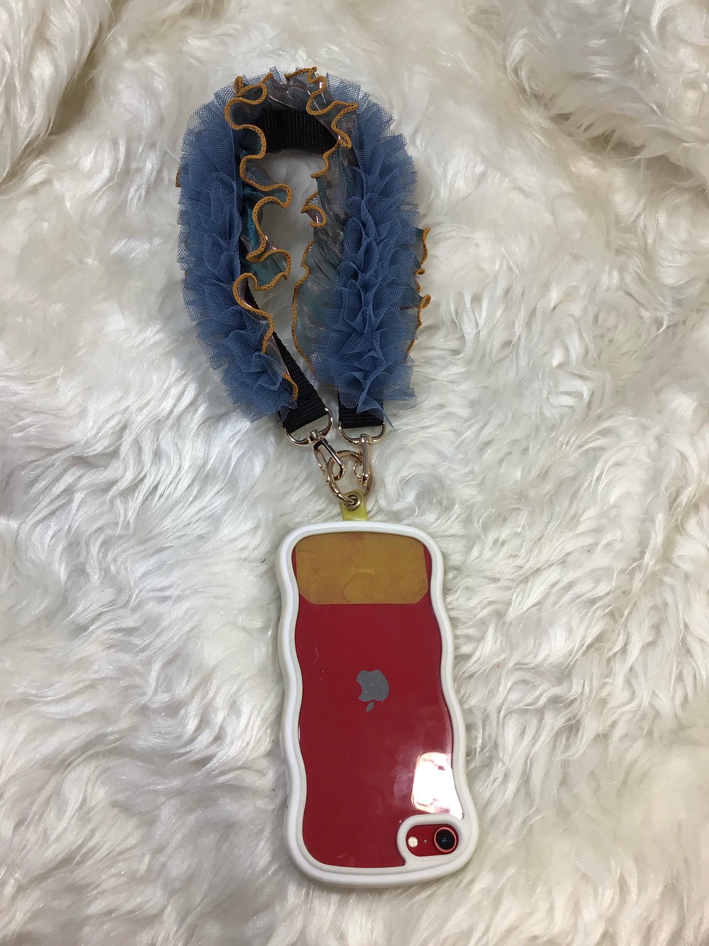 チュールレースとフリルレースを使用した、かわいらしいスマホストラップです。デザイン性が高く、シンプルなコーディネートに華やかさを添えるアイテムとして最適です。バッグハンドルとしても使える2WAY仕様で、日常使いから特別なシーンまで活躍します。