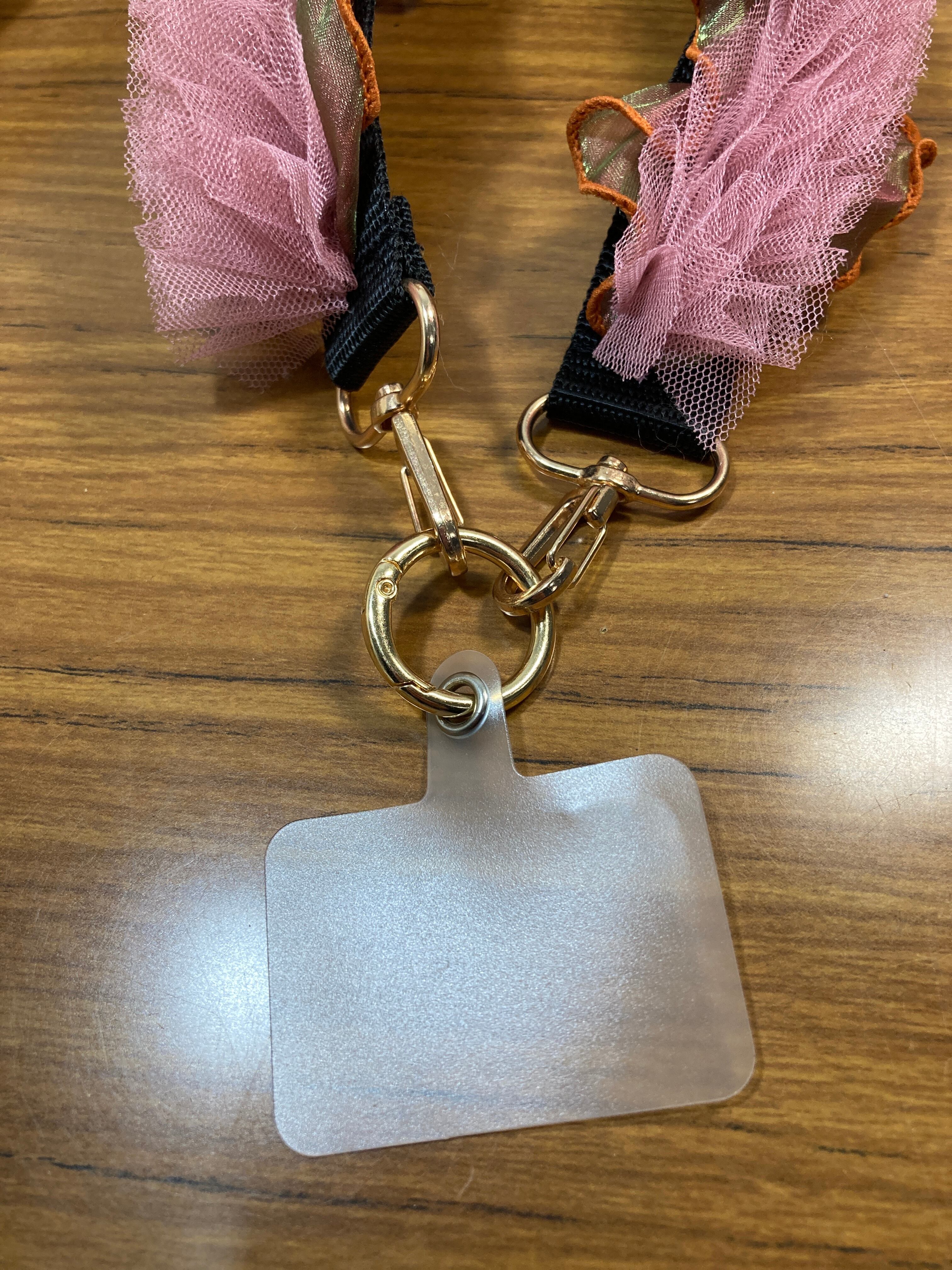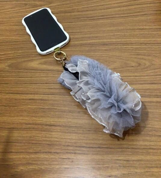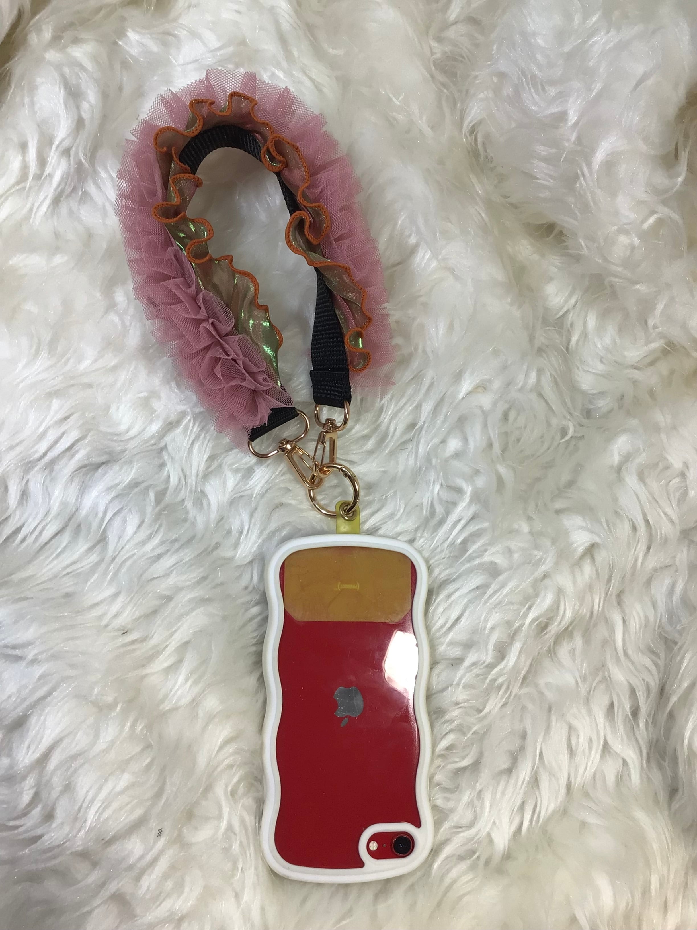 チュールレースとフリルレースを使用した、かわいらしいスマホストラップです。デザイン性が高く、シンプルなコーディネートに華やかさを添えるアイテムとして最適です。バッグハンドルとしても使える2WAY仕様で、日常使いから特別なシーンまで活躍します。