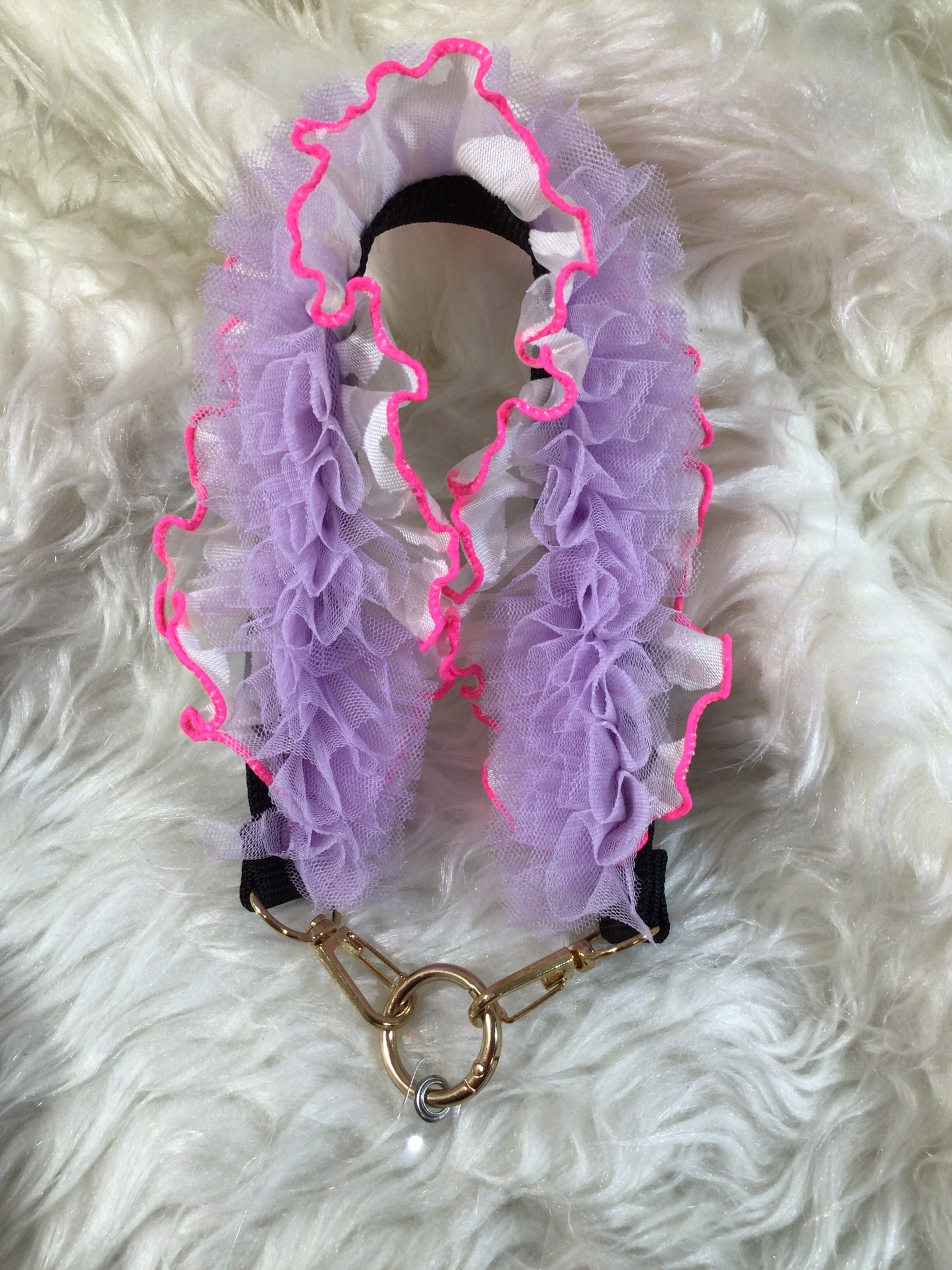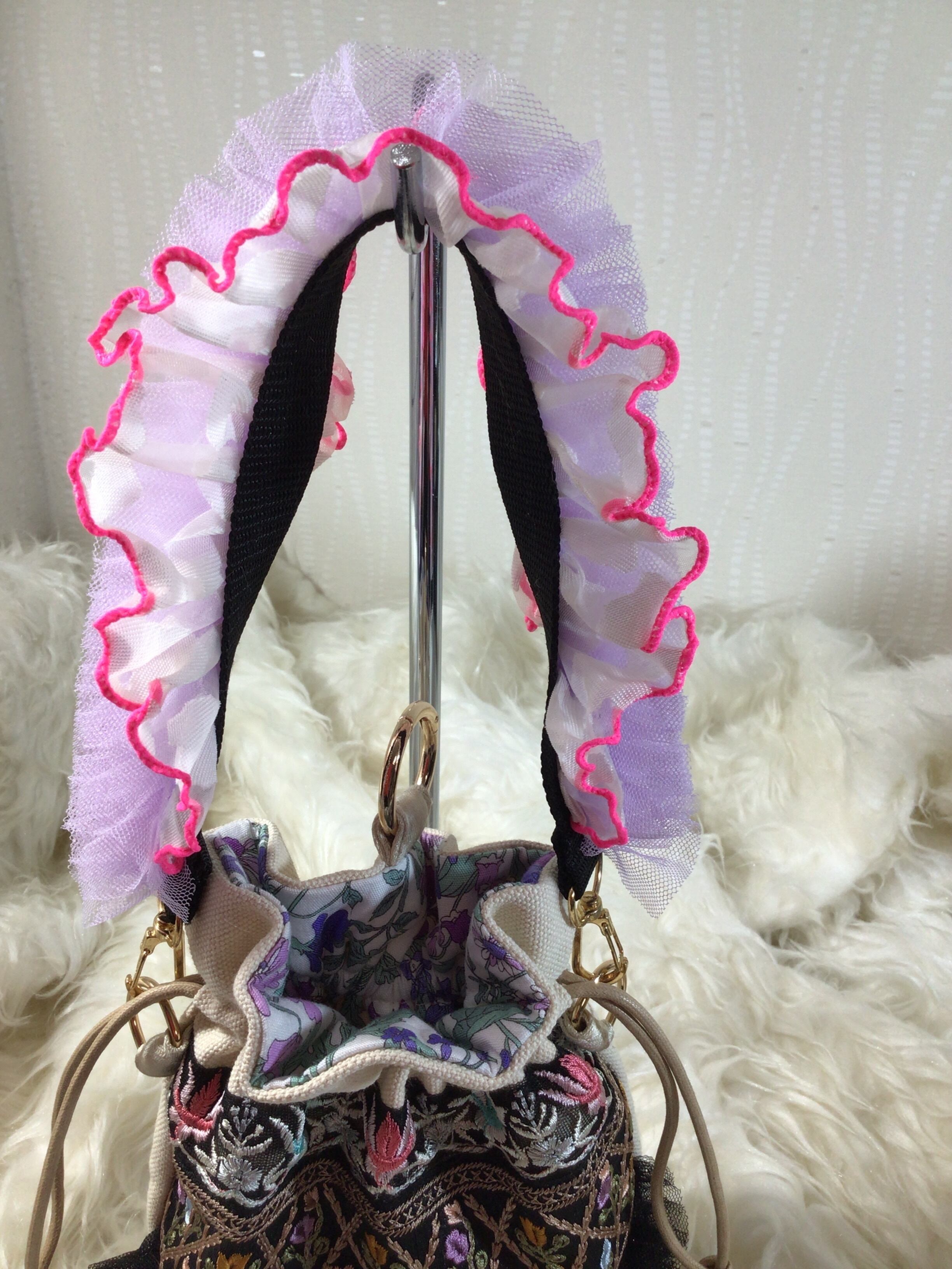 チュールレースとフリルレースを使用した、かわいらしいスマホストラップです。デザイン性が高く、シンプルなコーディネートに華やかさを添えるアイテムとして最適です。バッグハンドルとしても使える2WAY仕様で、日常使いから特別なシーンまで活躍します。