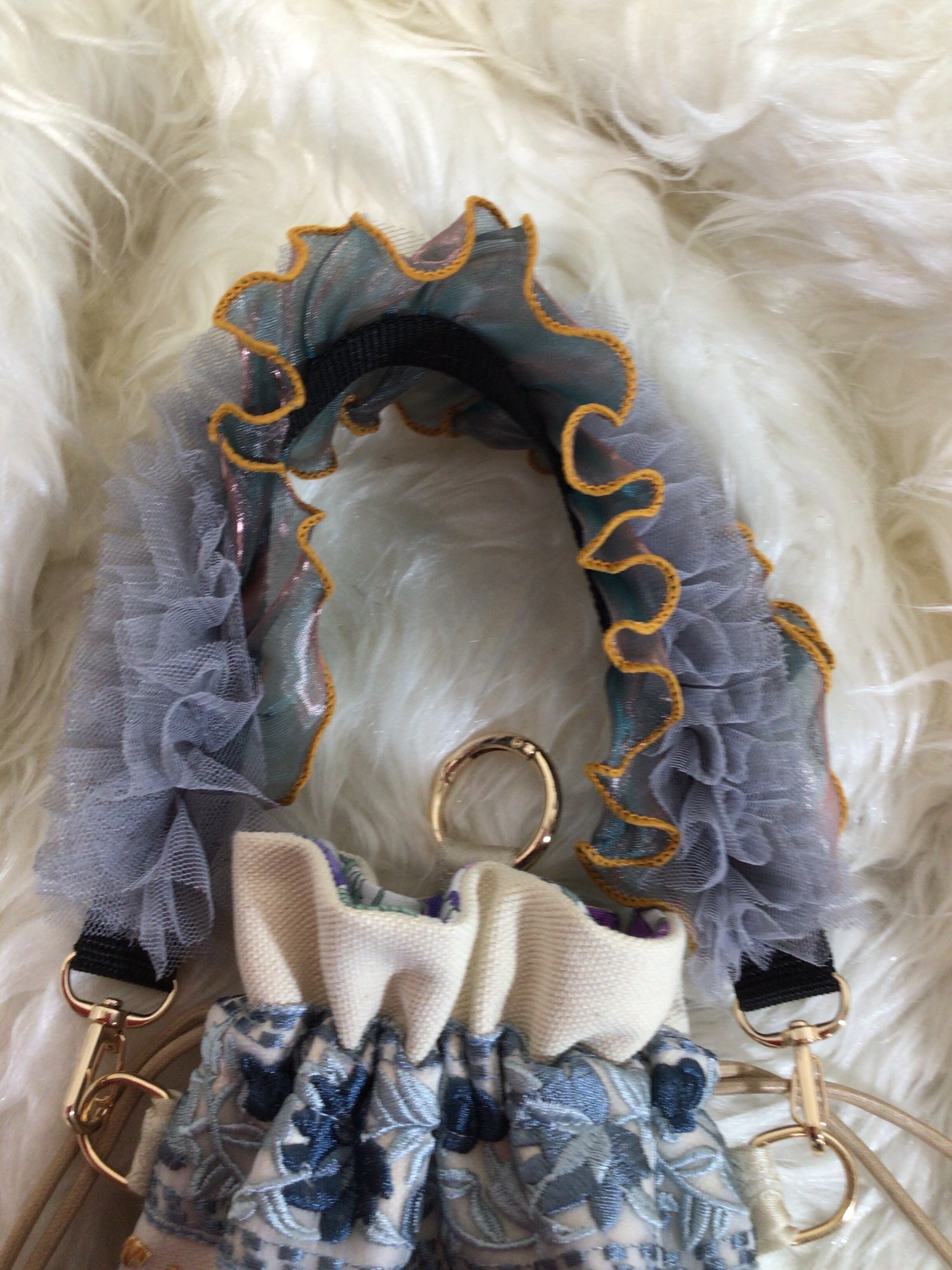 チュールレースとフリルレースを使用した、かわいらしいスマホストラップです。デザイン性が高く、シンプルなコーディネートに華やかさを添えるアイテムとして最適です。バッグハンドルとしても使える2WAY仕様で、日常使いから特別なシーンまで活躍します。