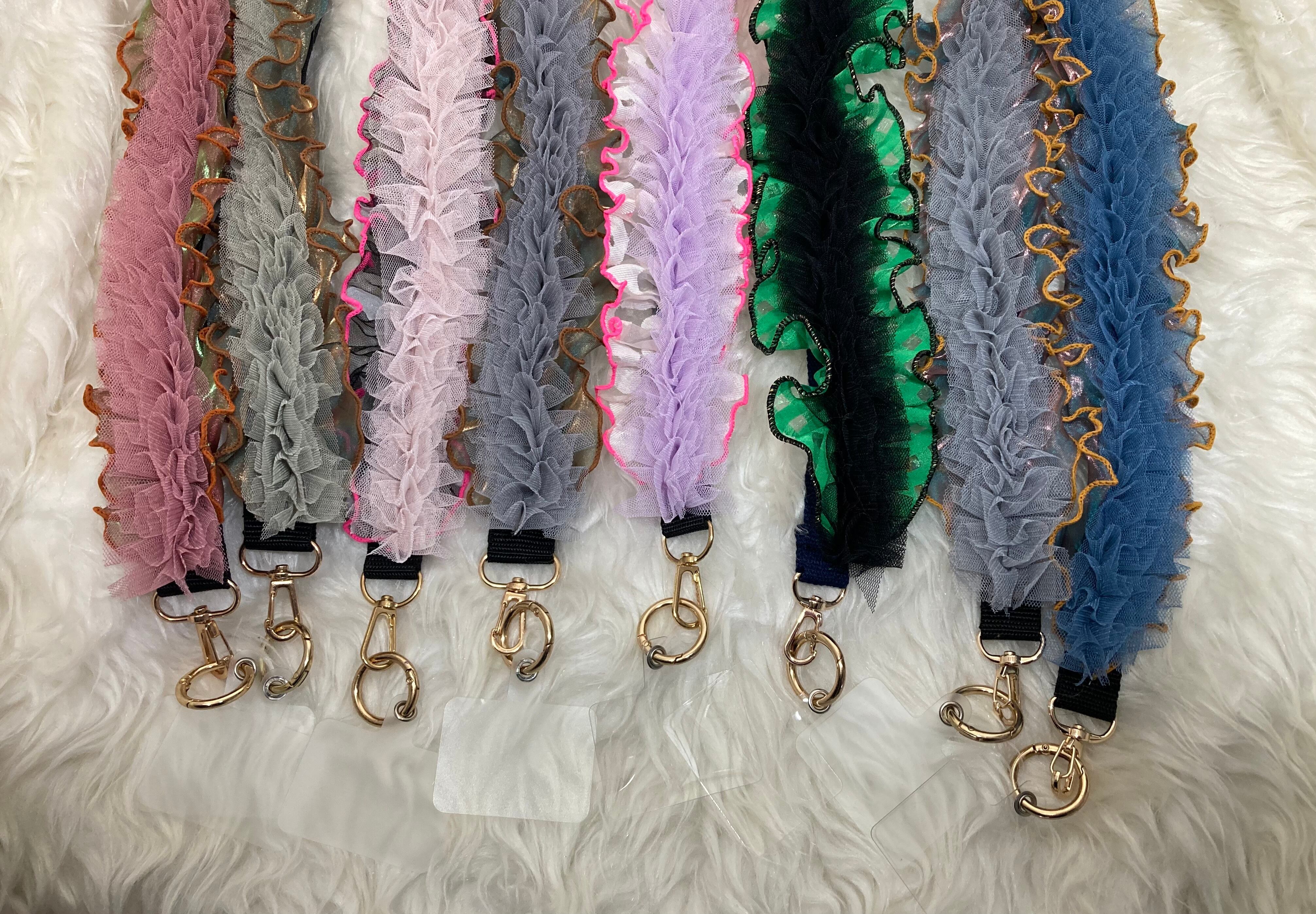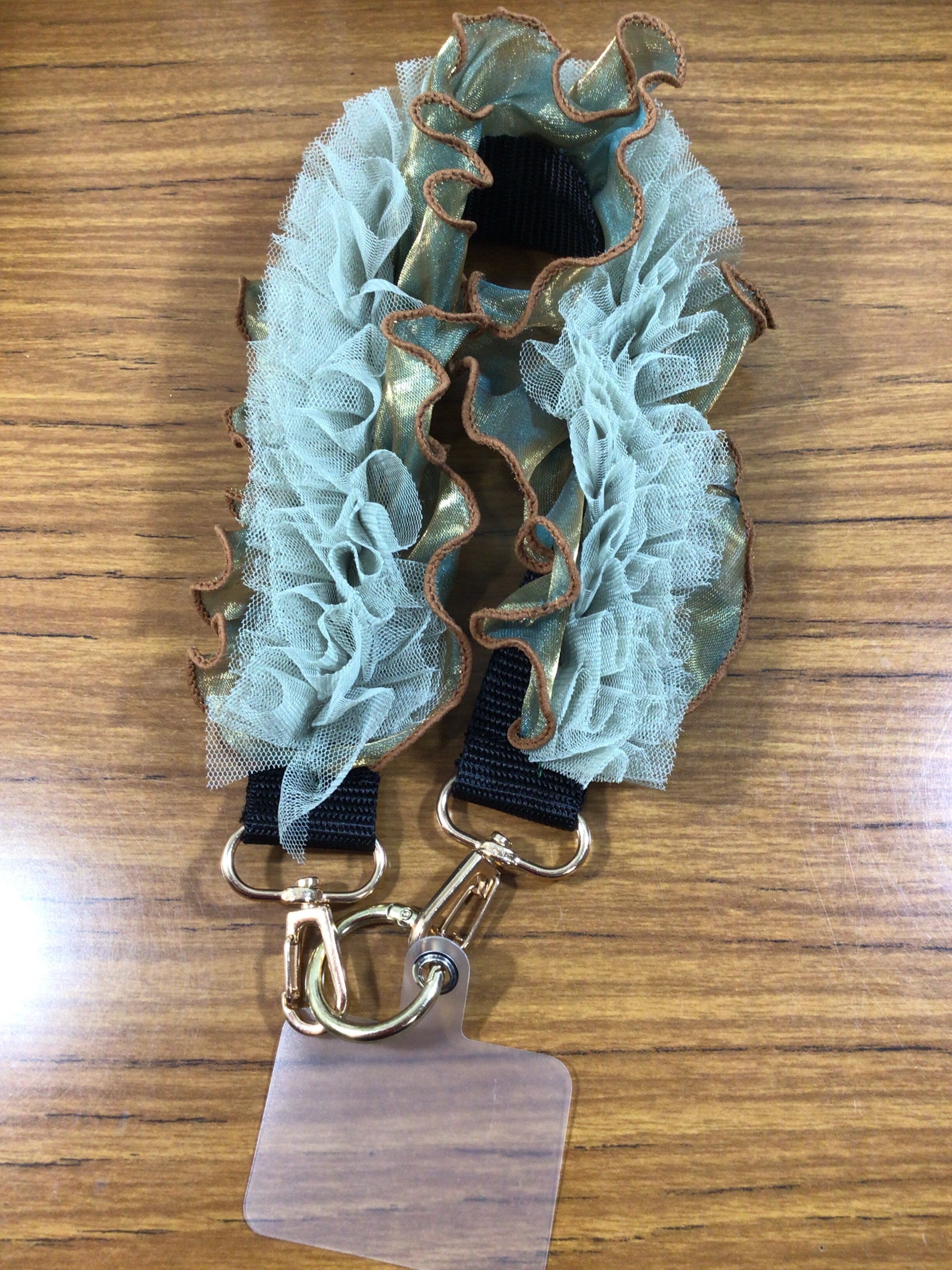 チュールレースとフリルレースを使用した、かわいらしいスマホストラップです。デザイン性が高く、シンプルなコーディネートに華やかさを添えるアイテムとして最適です。バッグハンドルとしても使える2WAY仕様で、日常使いから特別なシーンまで活躍します。